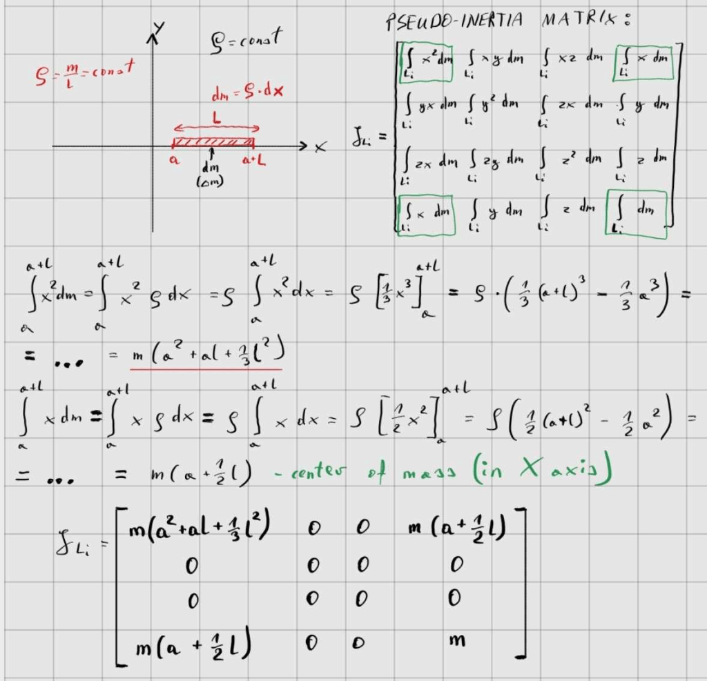 We treat the rod as a one-dimensional element, meaning that its mass extends only in the X dimension. Other dimensions are negligible for analysis. This means that in the pseudo inertia matrix, we only consider elements that do not contain either Y or Z. At the same time, it is immediately apparent that the moments of deviation are zero, as the rod is symmetrical.